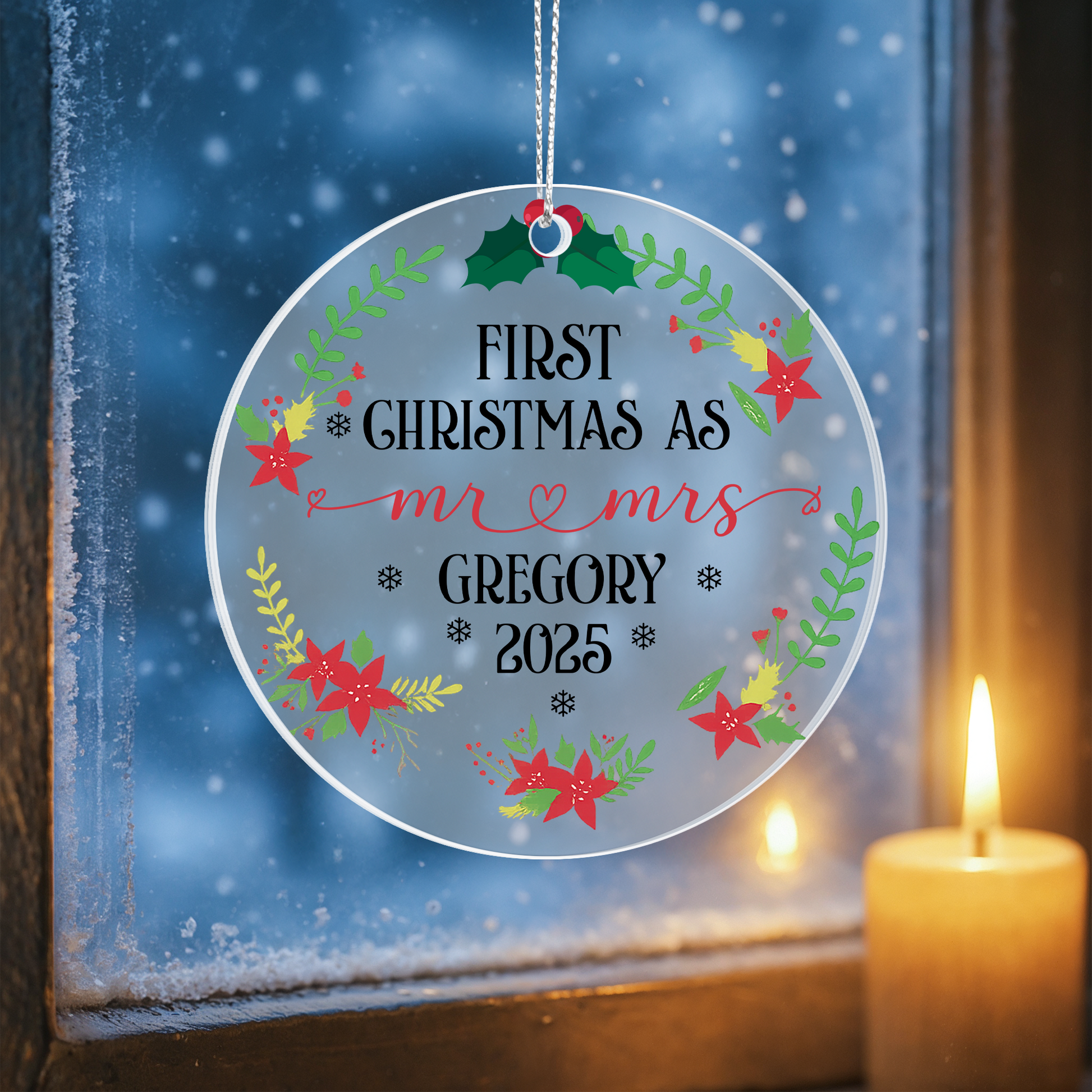 Celebrate your first Christmas as Mr. & Mrs. with this elegant personalized acrylic ornament, a timeless keepsake that captures the joy of your new beginning.