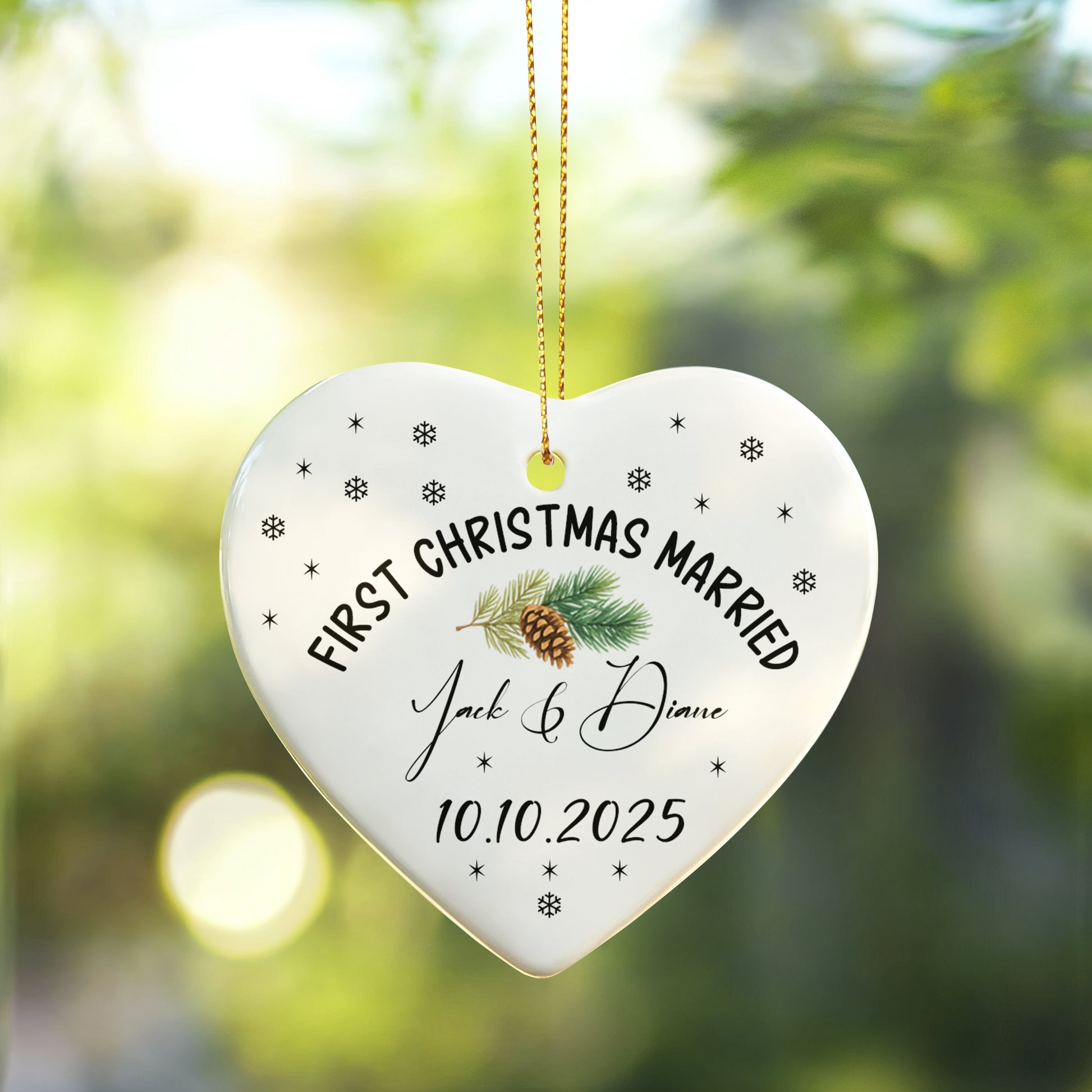 First Christmas Married Ornament 2025 – Personalized Ceramic Heart Ornament for Couples, Pinecone Christmas Decoration, Custom Newlywed Gift