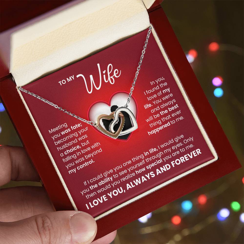 Celebrate the love you share with this elegant Interlocking Hearts Necklace, a timeless symbol of two souls forever connected. Designed especially as a heartfelt gift for your wife, this necklace comes beautifully presented with a romantic message card that expresses love, devotion, and commitment.