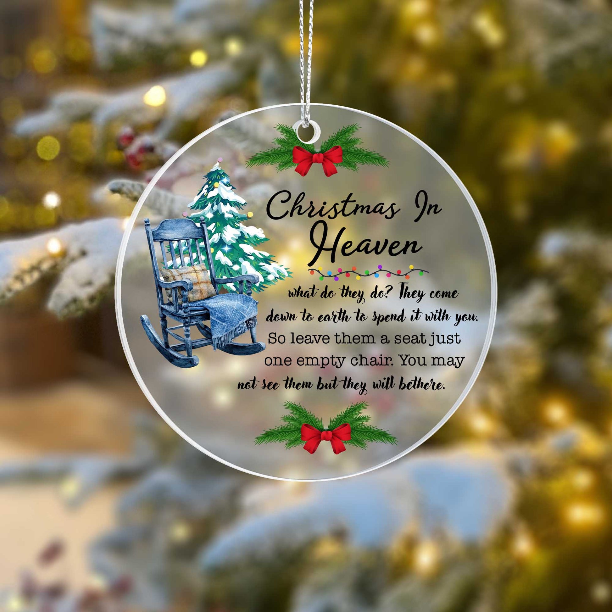 Honor your loved ones with this heartfelt "Christmas in Heaven" acrylic Christmas ornament. Featuring a rocking chair and a Christmas tree, this ornament beautifully expresses the sentiment, "What do they do? They come down to earth to spend it with you. So leave them a seat, just one empty chair. You may not see them, but they will be there."