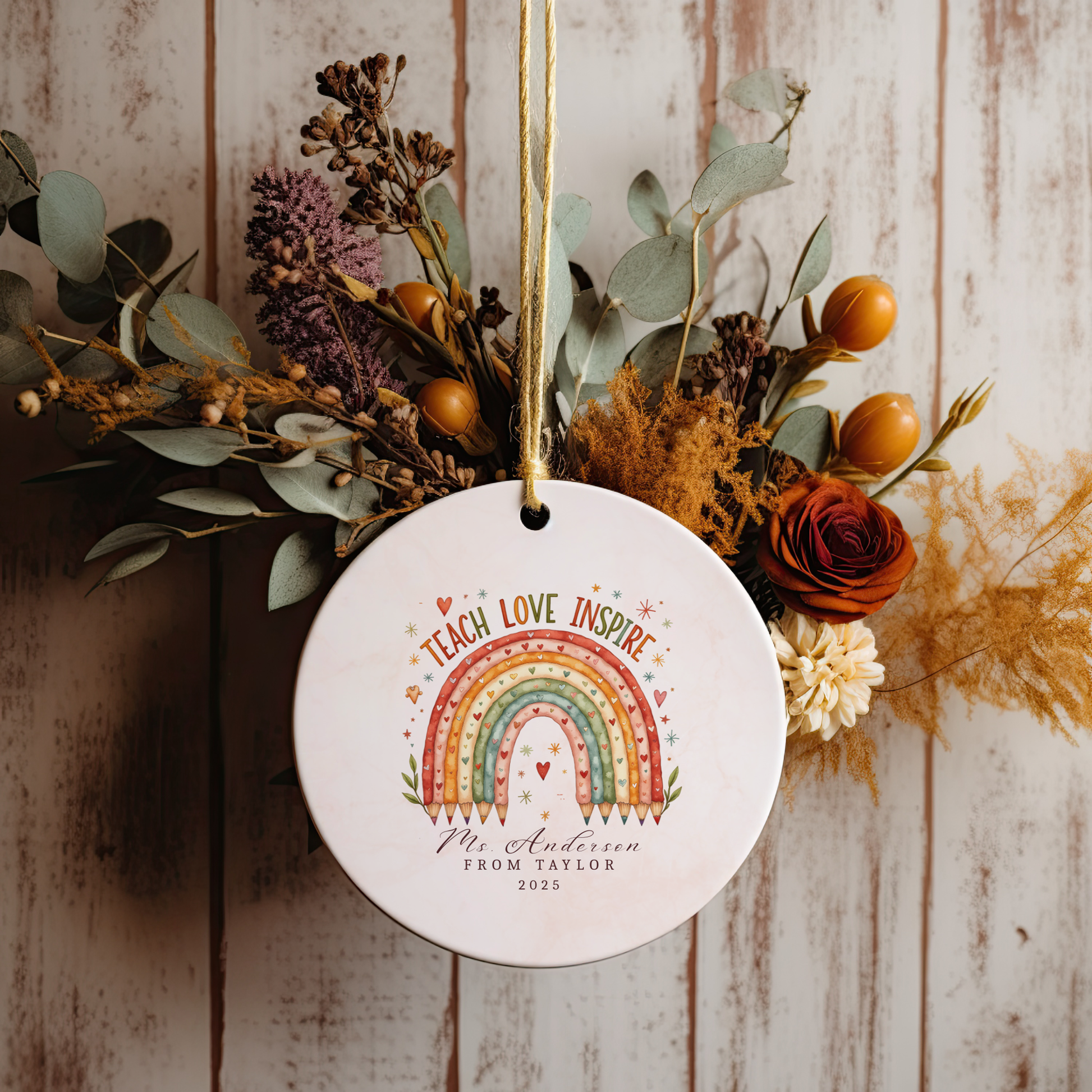 Personalized Teacher Ornament – Custom Name Christmas Gift from Student – Teach Love Inspire Rainbow Keepsake